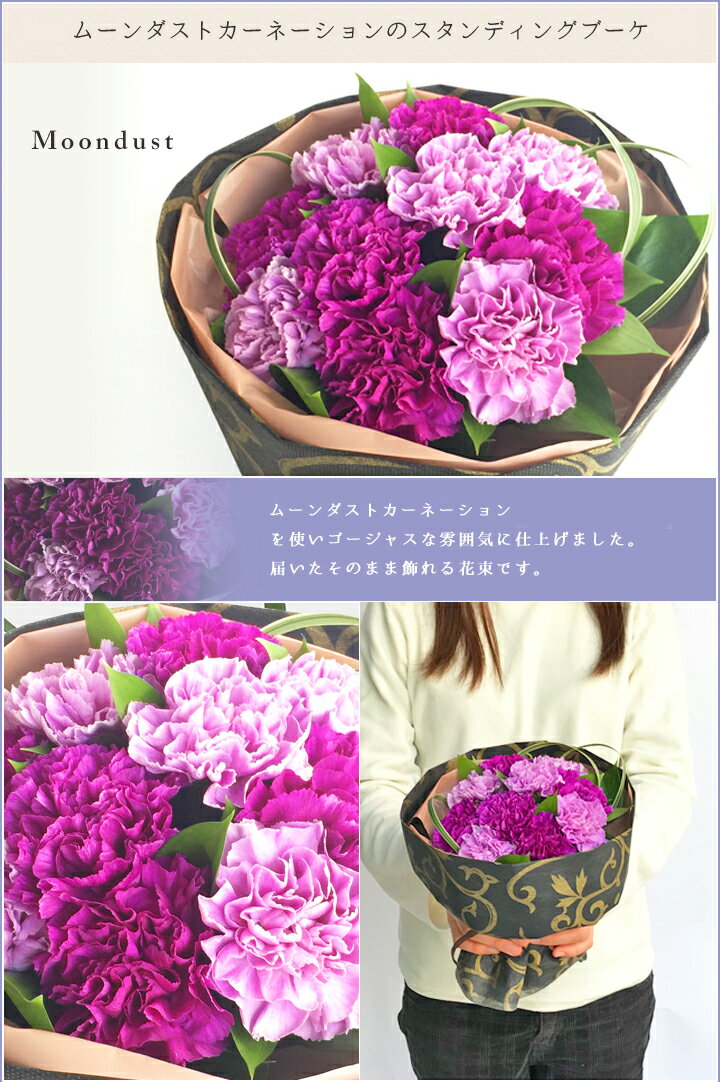 画像配信サービス6/18着〜6/25着中止となりますムーンダストカーネーション花束の解説 ●ムーンダストカーネーションのスタンディングブーケ ムーンダストカーネーション10本を使った ゴージャスな雰囲気に雰囲気のスタンディングブーケです。