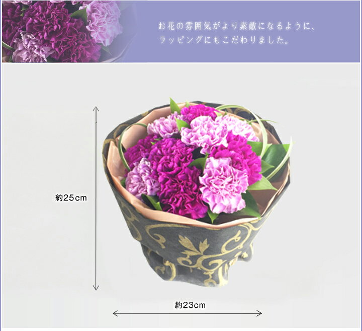 ムーンダストカーネーション花束詳細 母の日特典 ・ご希望日にお届け ・母の日メッセージカード付 サイズ タテ25cm×ヨコ23cm ギフト対応 ムーンダストは、サントリーとオーストラリアのフロリジン社との共同開発によって生まれた青い色のカーネーションです。
