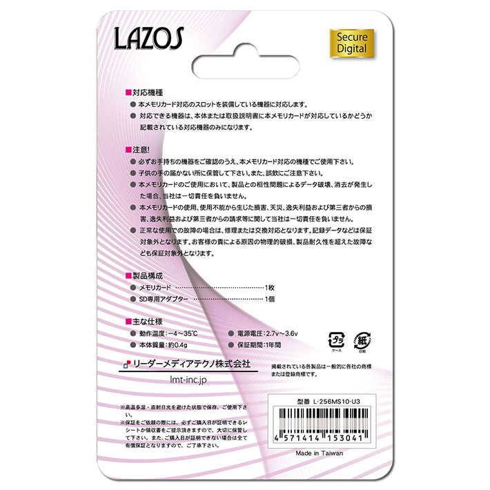 【商品型番】L-256MS10-U3 JANコード 4571414153041 【転送速度】UHS-I U3 CLASS10 相当 【サイズ】本 体 縦32.0×横24.0×厚さ2.1mm パッケージ 縦130mm x 横82mm 【保証期間】1年間 ●必ずお手持ちの機器をご確認のうえ、本メモリカード対応の機種でご使用下さい。