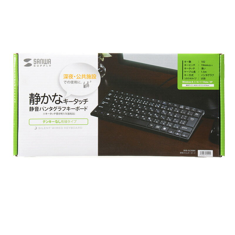 <仕様>■カラー:ブラック■キー数:85キー■キーピッチ:19mm(文字キー以外は除く)■キー表示:日本語109A配列■インターフェース:USB ■キースイッチ:パンタグラフ■キーストローク:2.0±0.1mm ■動作力:50±20g ■消費電流:100mA以下■サイズ:W293×D115×H19mm■重量:260g■ケーブル長:1.5m■対応機種:各社Windows搭載(DOS/V)パソコン※ただし、USBポートを持ちパソコン本体メーカーがUSBポートの動作を保証している機種■対応OS:Windows8.1・8(64bit/32bit)・7(64bit/32bit)・Vista・XP<関連キーワード>SKB-SL20BK,キーボード,有線,静音,コンパクト,USB,パソコン,ブラック,パンダグラフ,スリム,テンキーなし,サンワサプライ,激安通販のイーサプライ