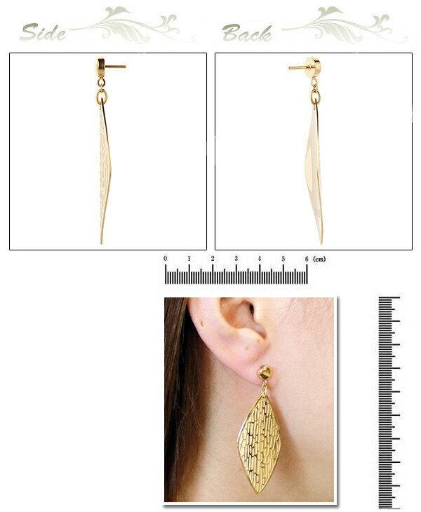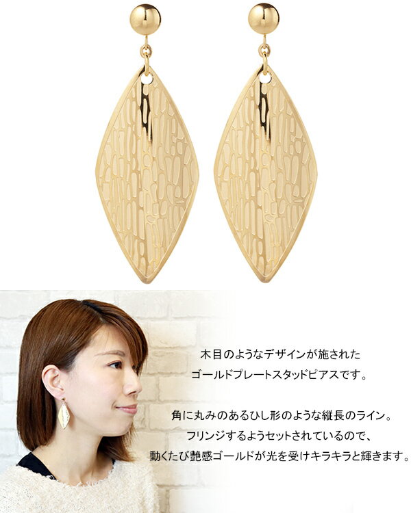 ギフト対応 素材: サージカルステンレス316L PVDコーティング サイズ: モチーフ:縦約41mm×横約19.5mm×厚み約0.7mm ポスト:長さ約10mm×太さ約0.8mm 木目のようなデザインが施されたゴールドプレートスタッドピアスです。